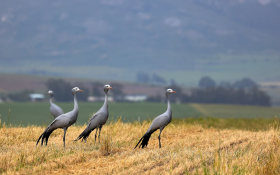 The Blue Crane (Anthropoides paradiseus) is an important element of South Africa’s natural heritage. It is a flagship for conservation in agricultural landscapes, from the rolling grasslands of KwaZulu-Natal to the expansive plains of the Karoo, to the patchwork of crops and renosterveld in the Western Cape.