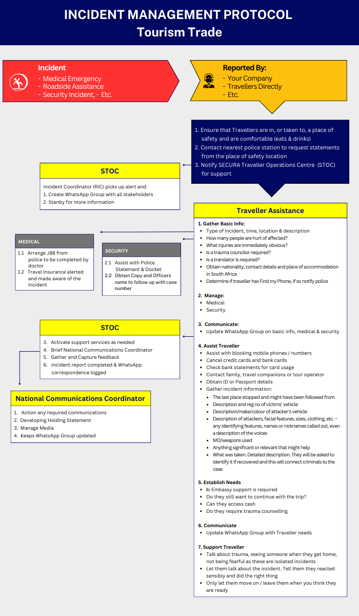 Please contact Hannelie du Toit at hannelie@satsa.co.za or Andre du Toit at info@securatraveller.co.za for any assistance with the Incident Management Protocol.